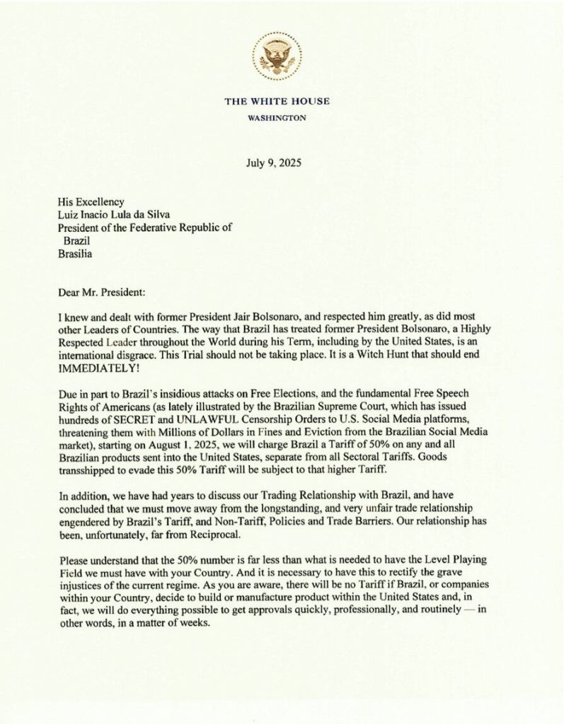 Se por algum motivo você decidir aumentar suas tarifas, então, qualquer que seja o número que você escolher para aumentá-las, será adicionado aos 50% que cobramos. Por favor, entenda que essas tarifas são necessárias para corrigir os muitos anos de políticas tarifárias e não-tarifárias e barreiras comerciais do Brasil, causando esses déficits comerciais insustentáveis contra os Estados Unidos.